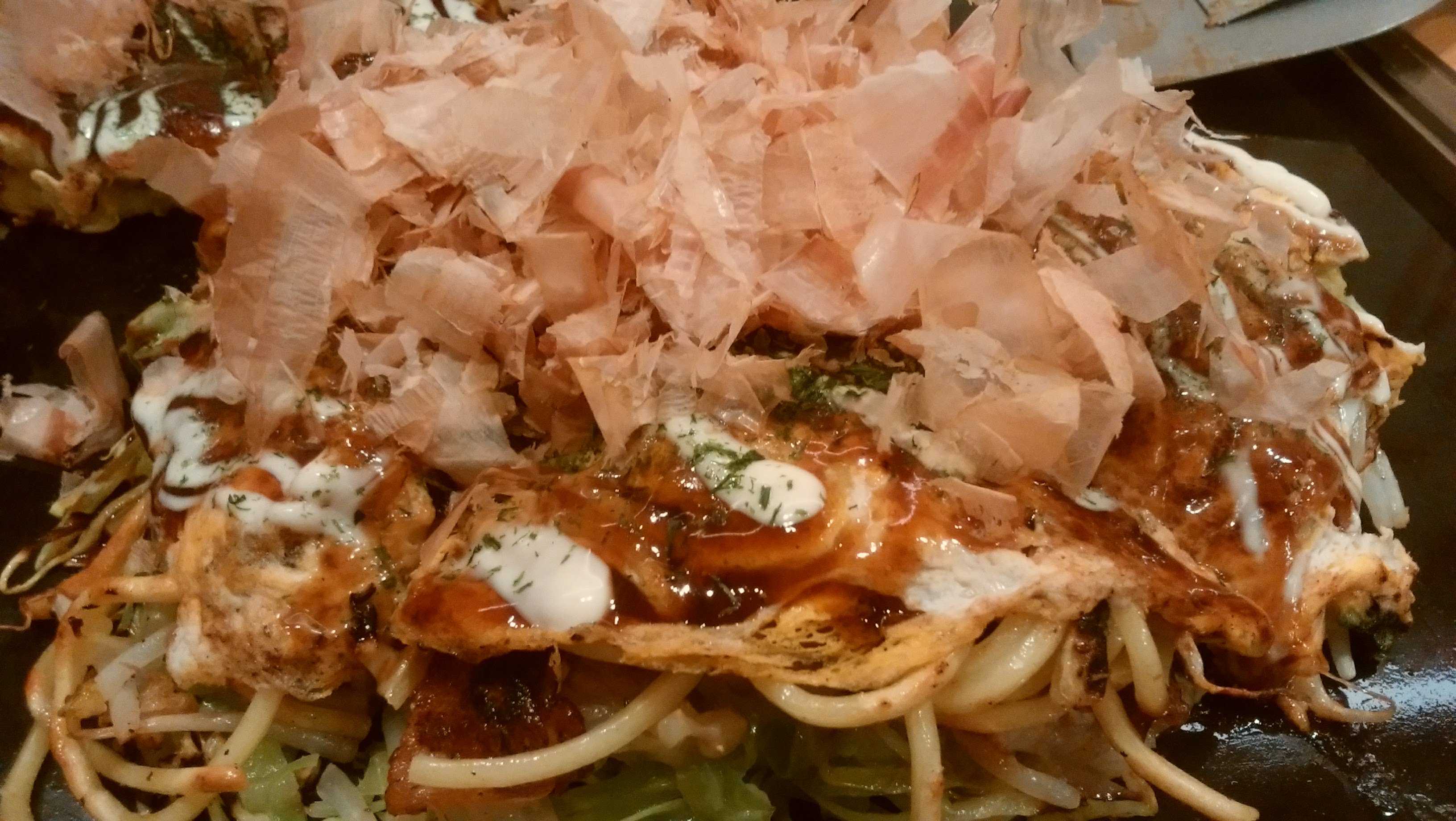 Sono piatti Teppan yaki (alla piastra). Okonomi yaki è una specie di torta salata con cavoli e carne o pesce, ed è la specialità di Osaka. Mentre